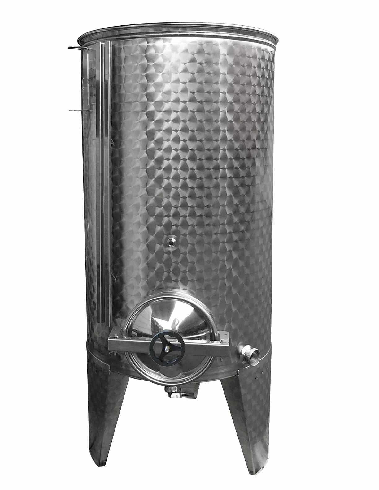 with three stainless steel welded-on legs, a DIN40 male-thread racking outlet, a concave bottom with V-channel to DIN40 male-thread final-drain outlet, and with a level/sight gauge and sampling tap. Also a crane to lift the lid (adds 350 mm to the height) with 1000 litre and 1250 litre:-