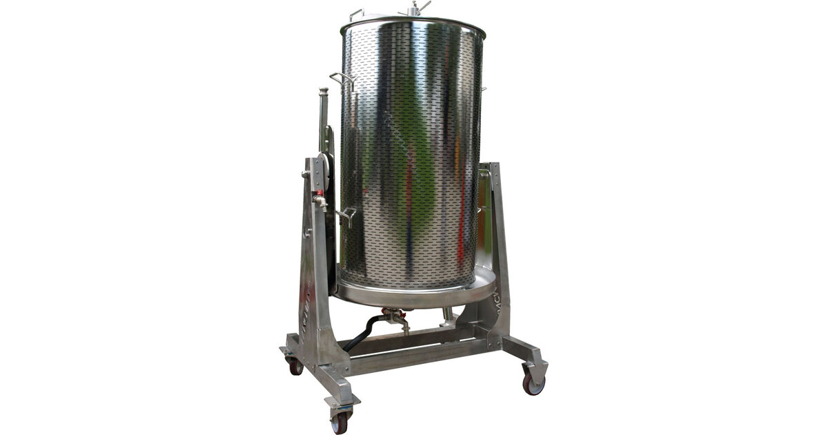 an increase in the amount of sludge/deposit in the press wine. The draining performed by the bed of grape marc also aids the clarity of the wine. Hydro-presses have a vertical neoprene-rubber-bladder inside a perforated stainless steel cylindrical basket. Pressure is exerted gently and evenly by the rubber bladder. The speed advantage of the hydro-press is due to the relatively thin layer of mash between bladder and cage wall, much less than with a traditional basket press. Note: before filling, the press-sack is placed around the inside of the stainless steel cylinder, the bottom of the sack should be tucked inwards so that it lays underneath